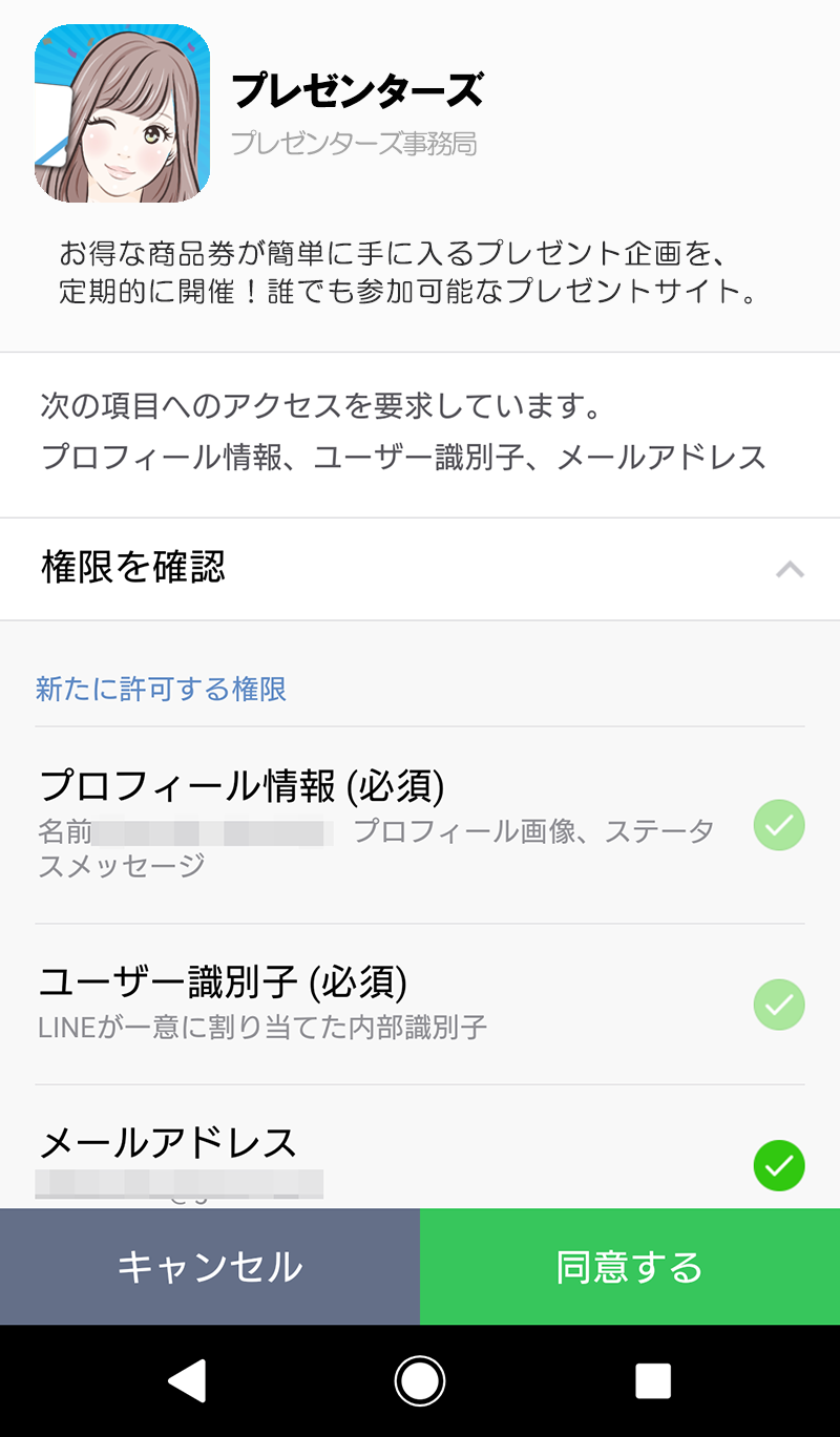 登録画面よりLINEを選択→アカウントにログインし認証画面をご確認・ご同意いただく事でご登録が完了いたします。このとき当サイトからの登録完了メール、キャンペーン情報メール等の各種ご案内メールをお届けするためSNSご登録のメールアドレスの取得を行いますのでご了承ください。